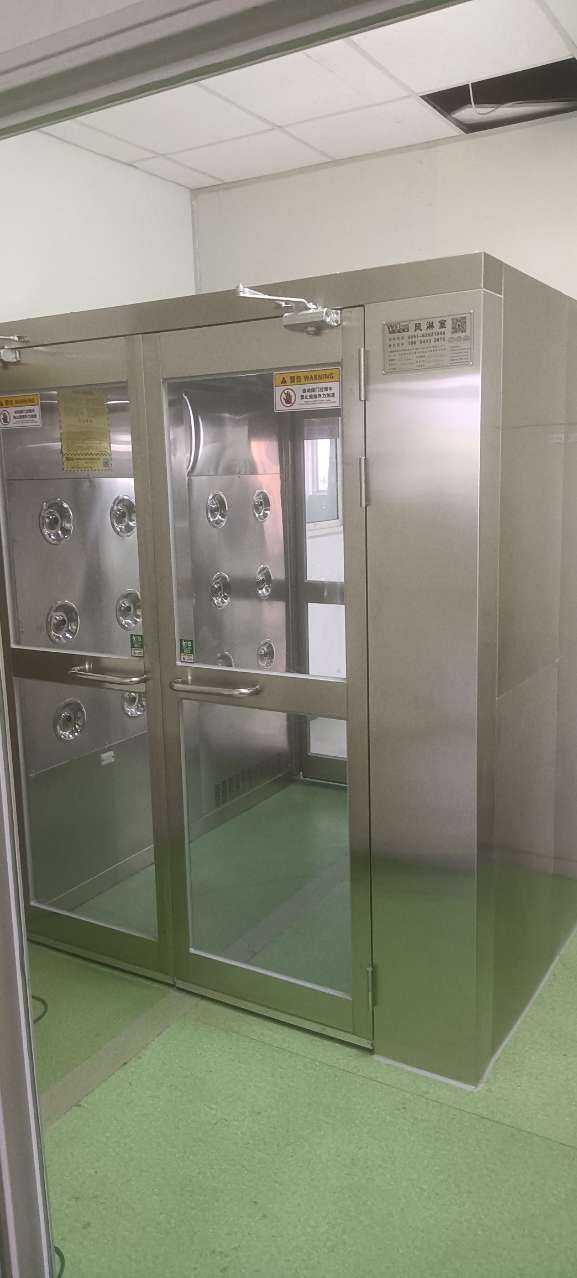 風淋室是人員進入潔凈室無塵車間所必備的凈化設備,通用性強,可與所有的潔凈室和潔凈廠房配套使用,工作人員進入車間時,必須通過此設備,用強勁潔凈的空氣,由可旋轉噴嘴從各個方向噴射至人身上,有效而迅速清除去附著在衣服上的灰塵、頭發、發屑等雜物,它可以減少人進出潔凈室所帶來的污染問題。風淋室的兩道門電子互鎖,可以兼起氣閘室的作用,阻止外界污染和未被凈化的空氣進入潔凈區域。